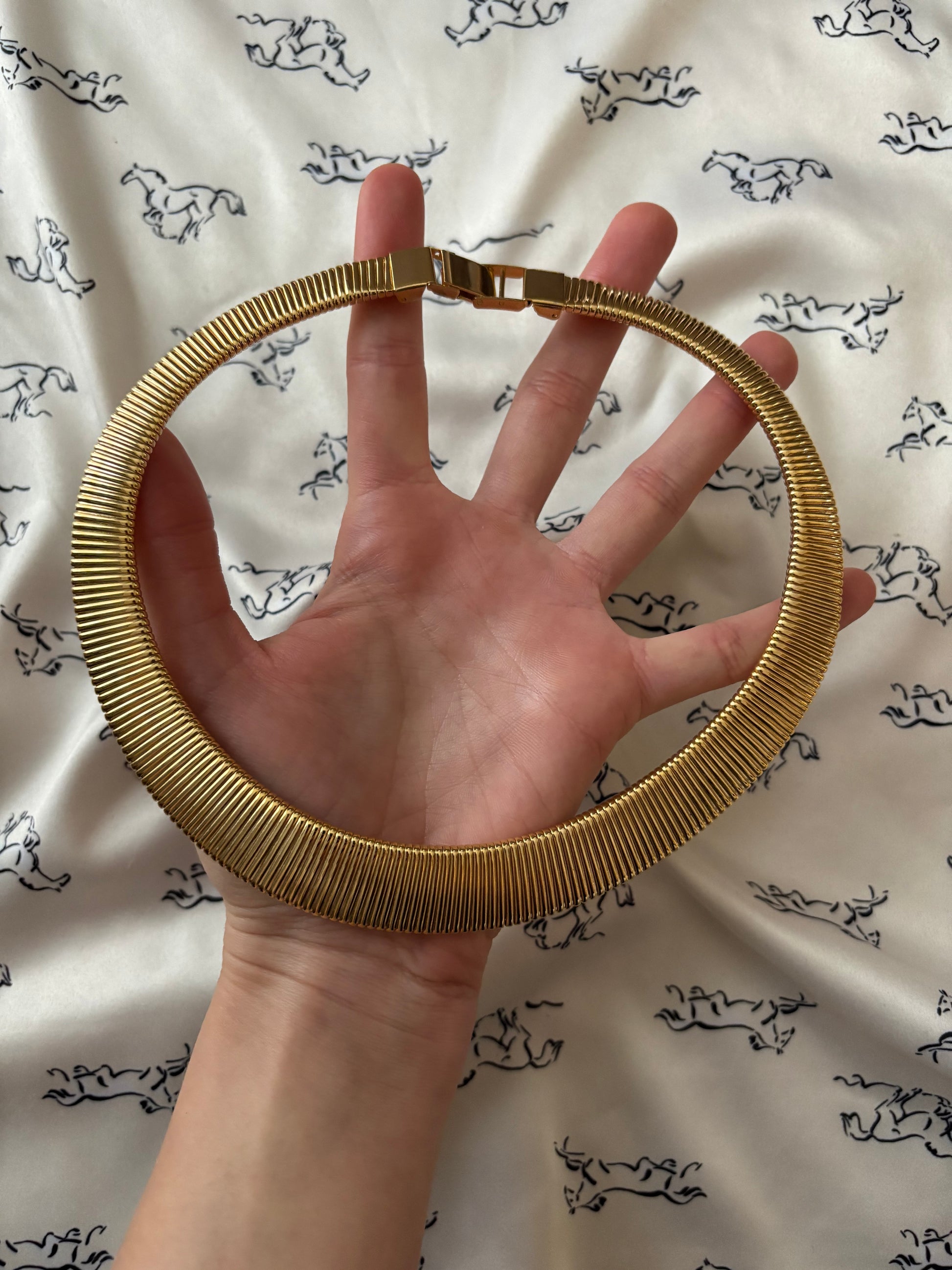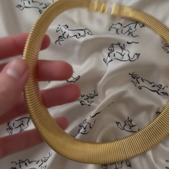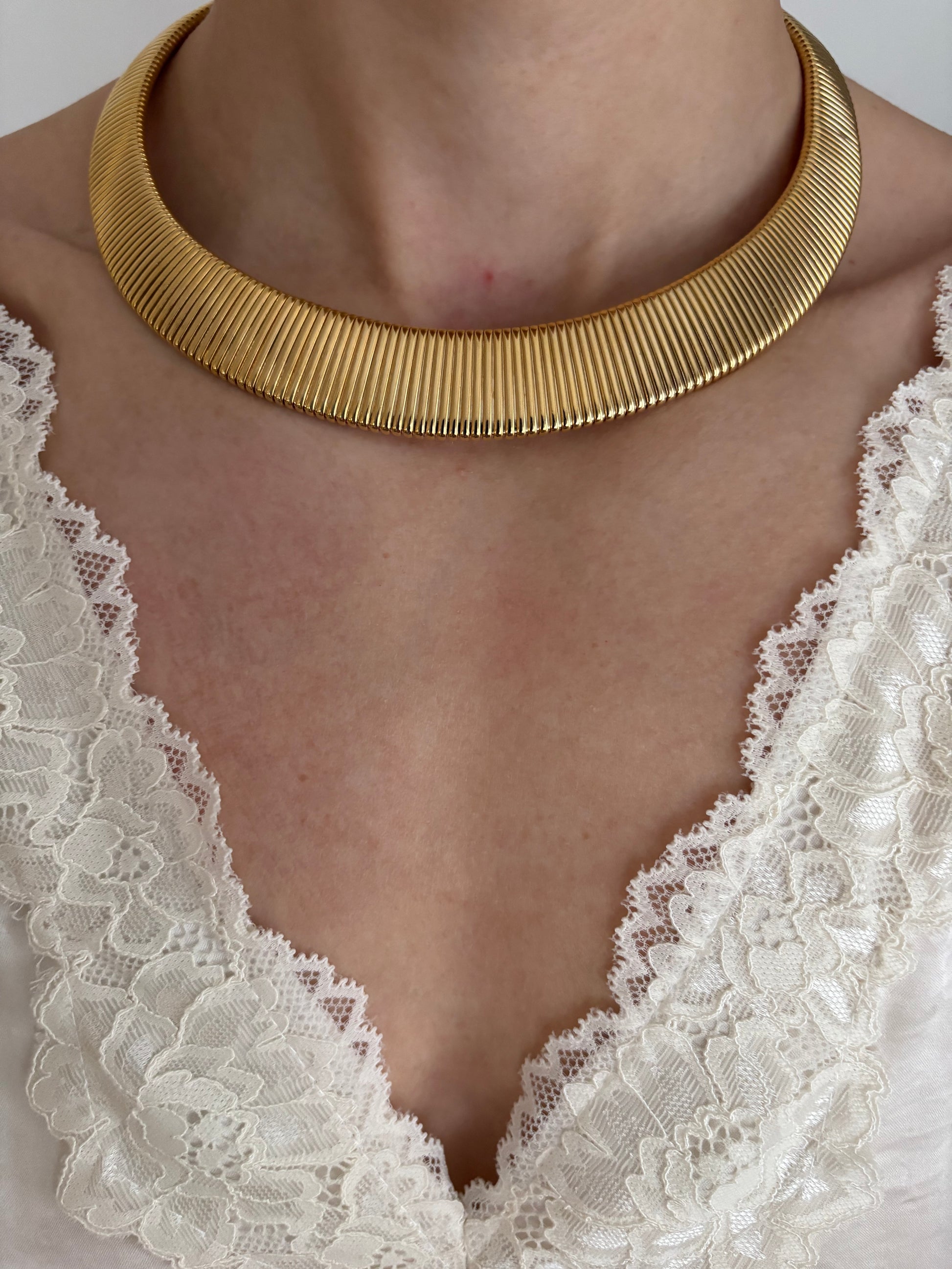 Naszyjnik wykonany w rozpoznawalnym stylu Omega — z gęstym, elastycznym splotem drobnych, równoległych ogniw, które tworzą efekt jednolitej, metalicznej wstęgi.