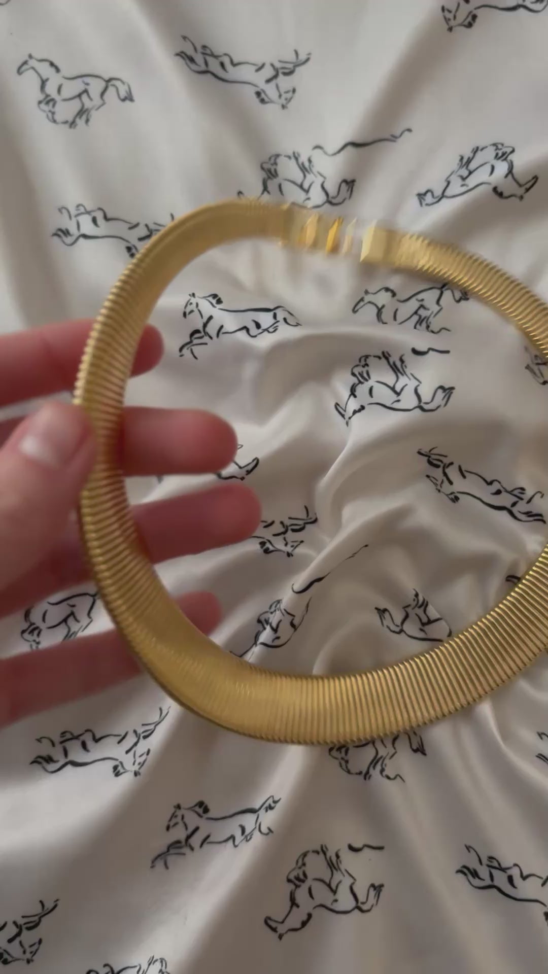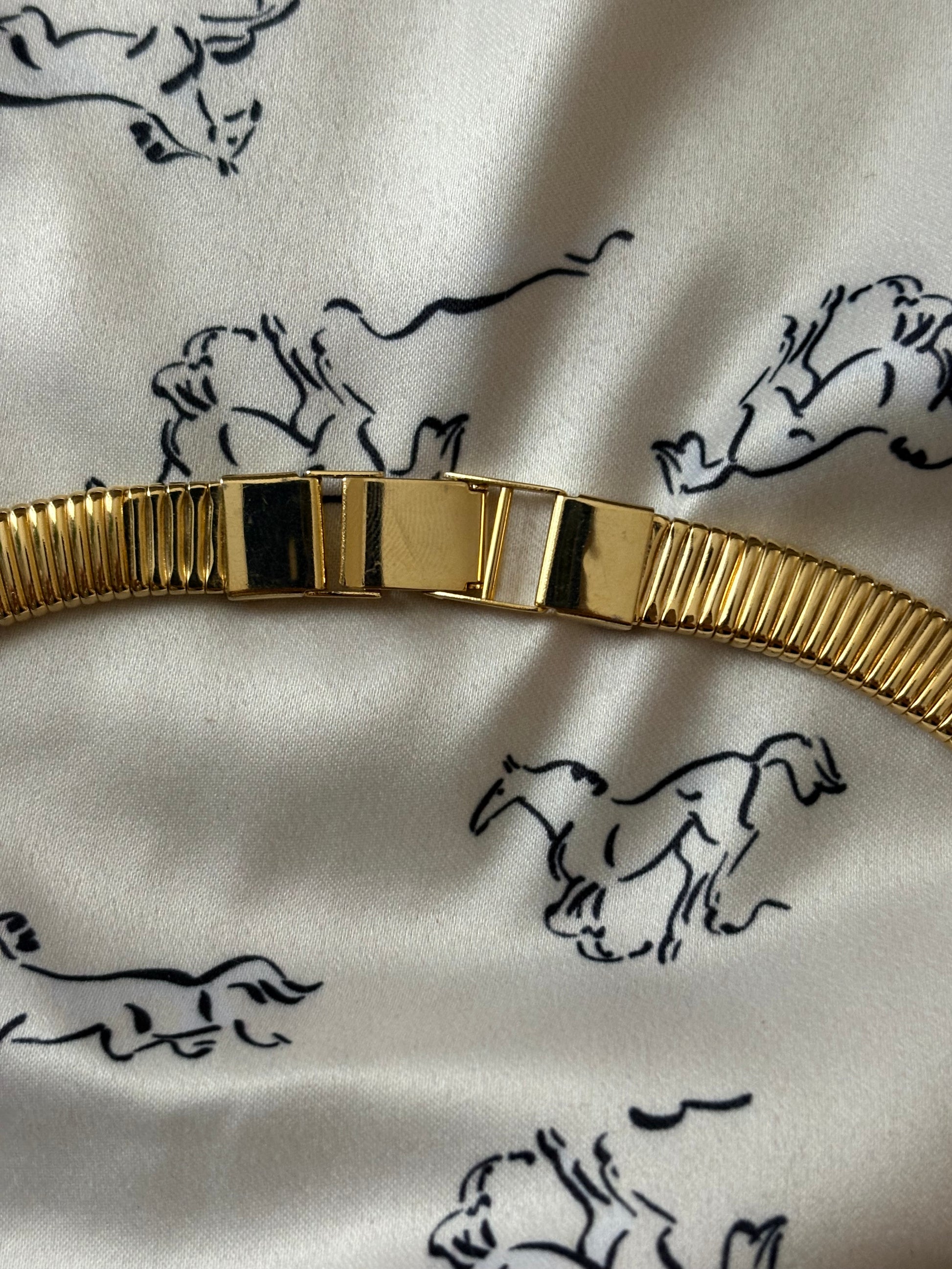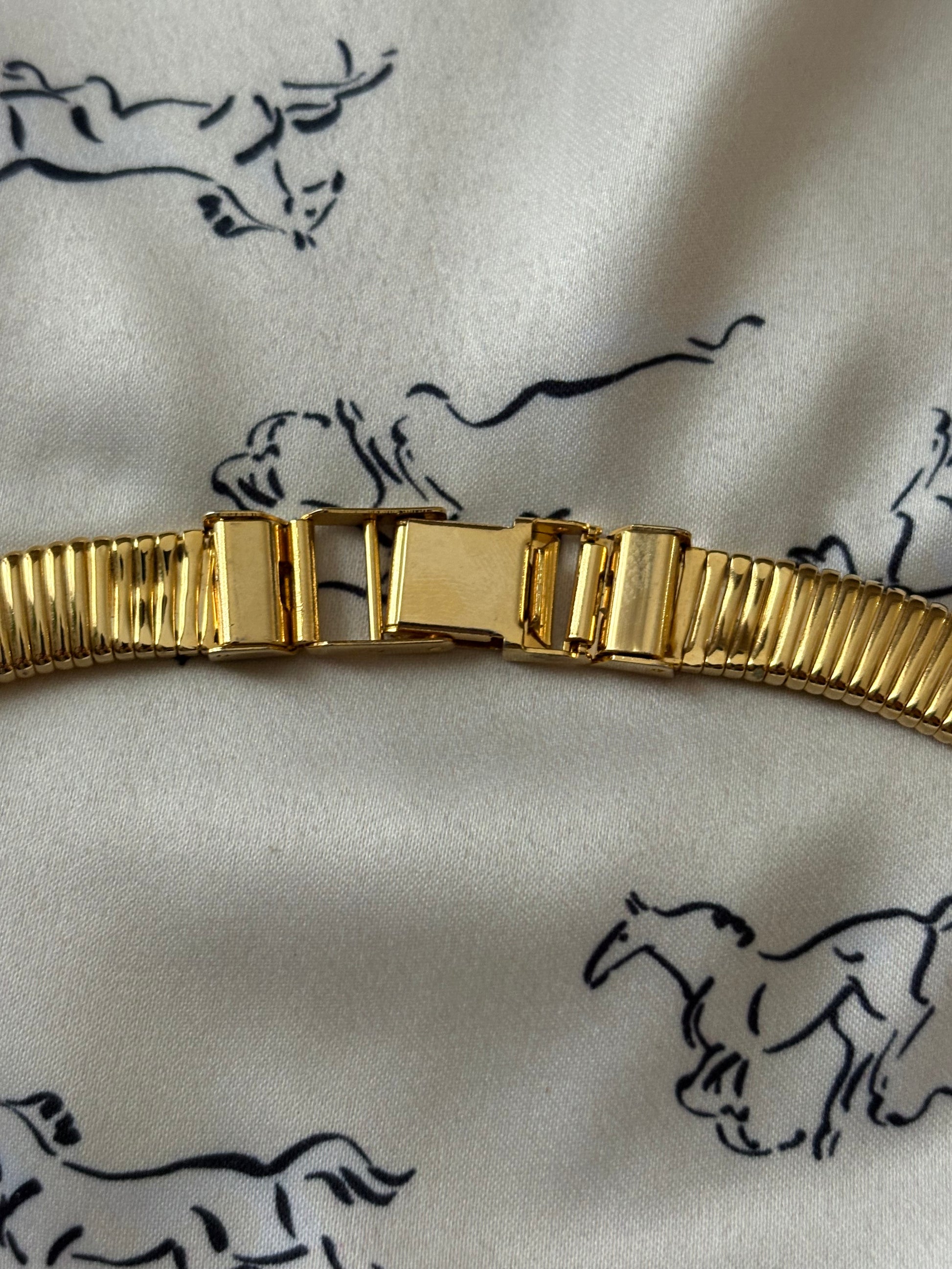 Naszyjnik wykonany w rozpoznawalnym stylu Omega — z gęstym, elastycznym splotem drobnych, równoległych ogniw, które tworzą efekt jednolitej, metalicznej wstęgi.