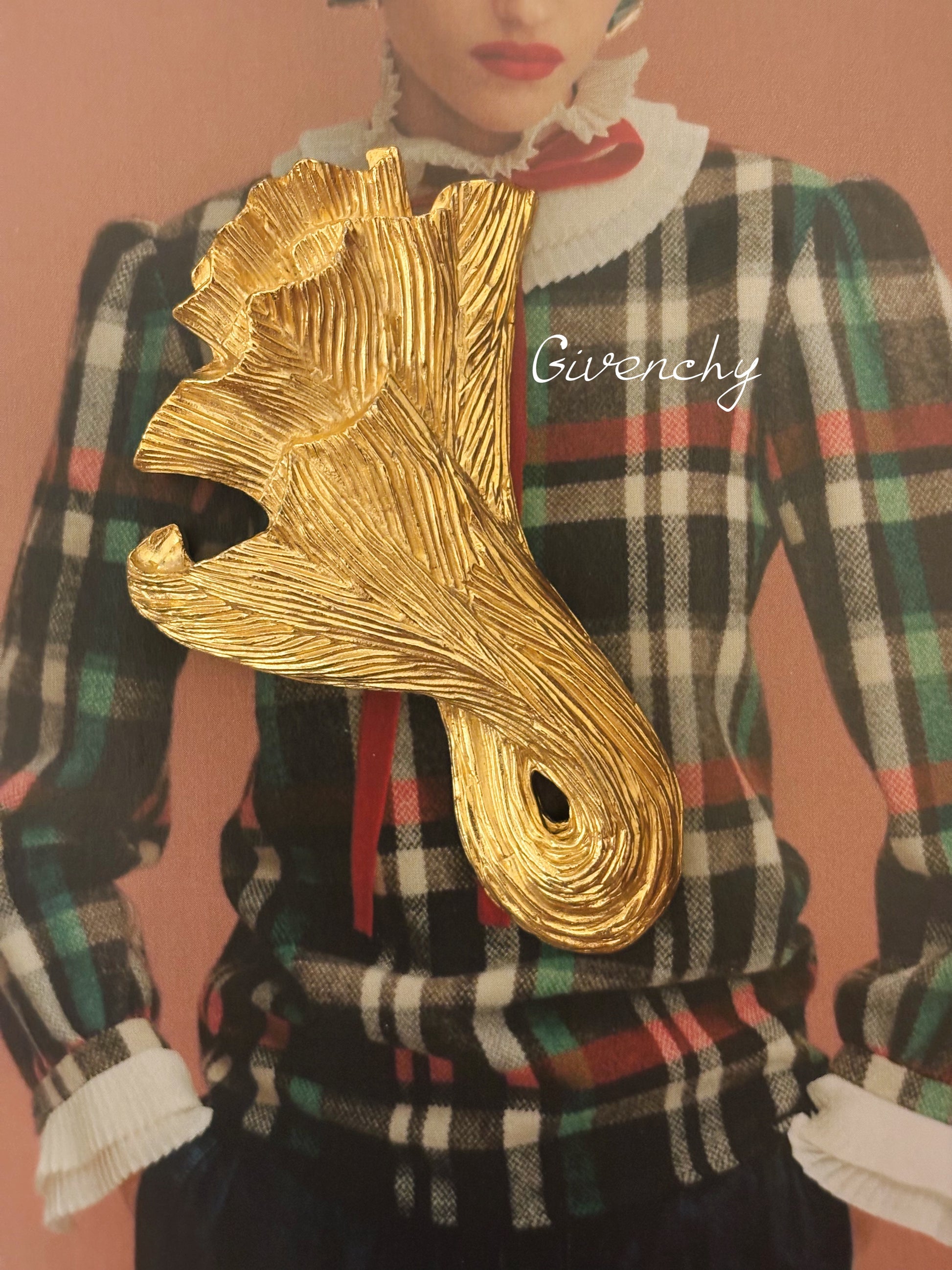 Charakterystyczna dla stylu lat 80., broszka zachwyca rzeźbioną fakturą. Tył broszki sygnowany jest okrągłym logo Givenchy.
