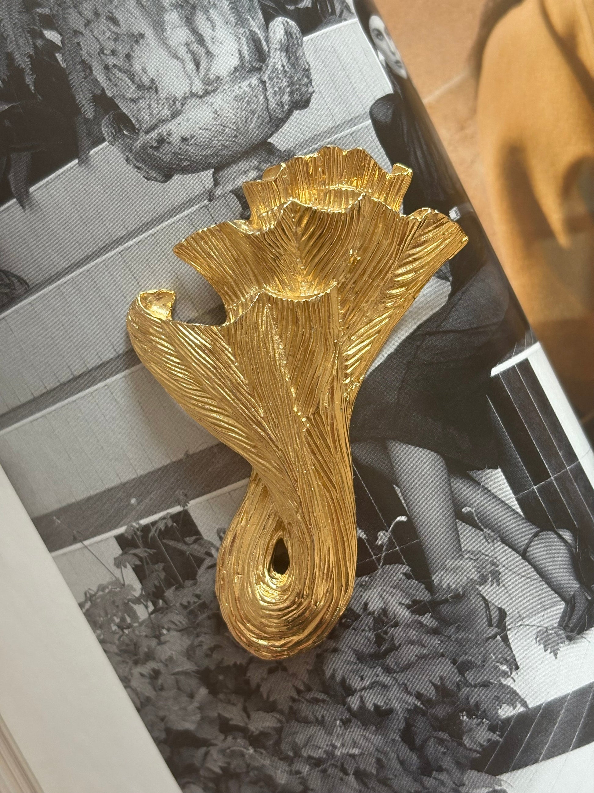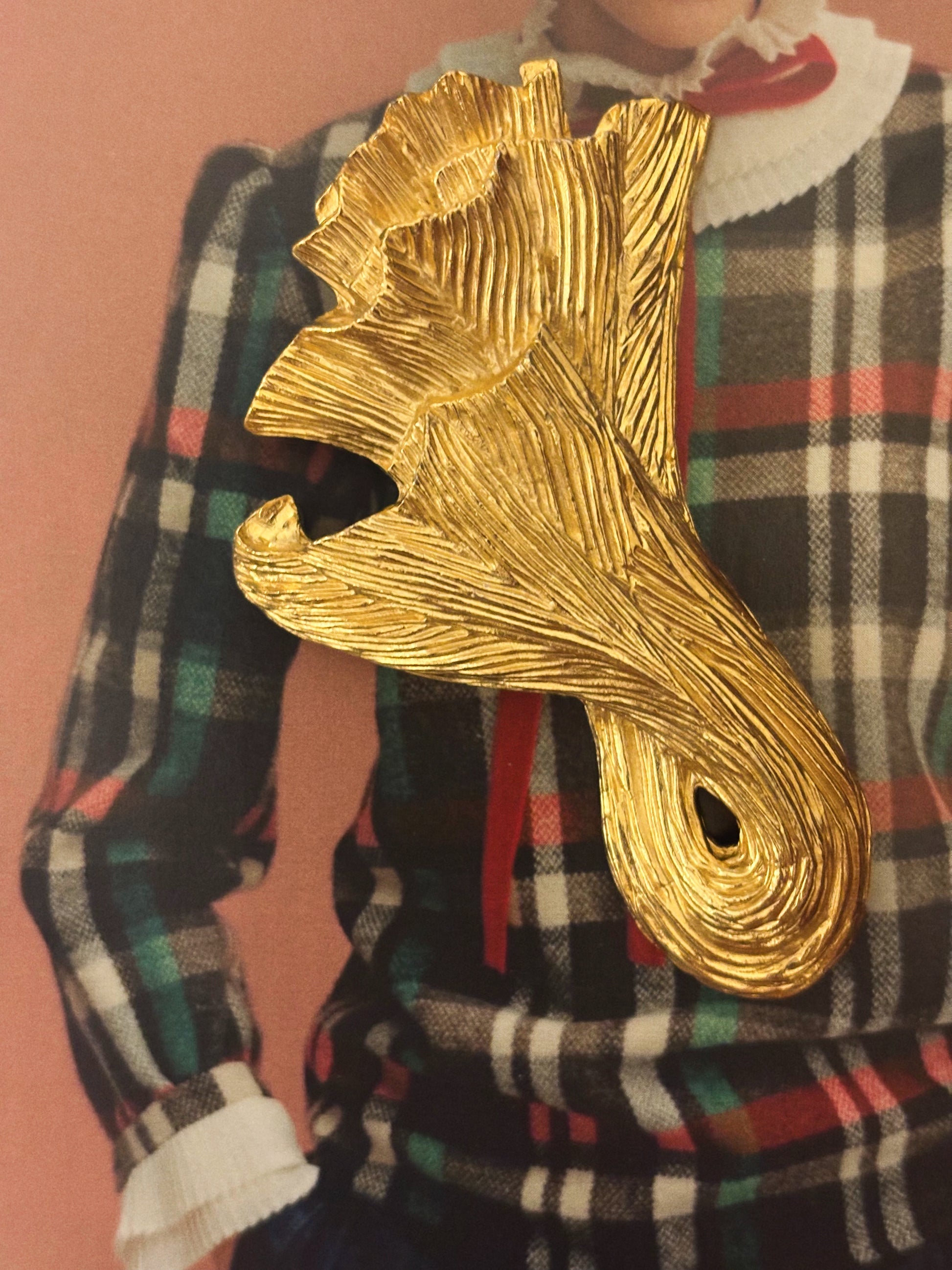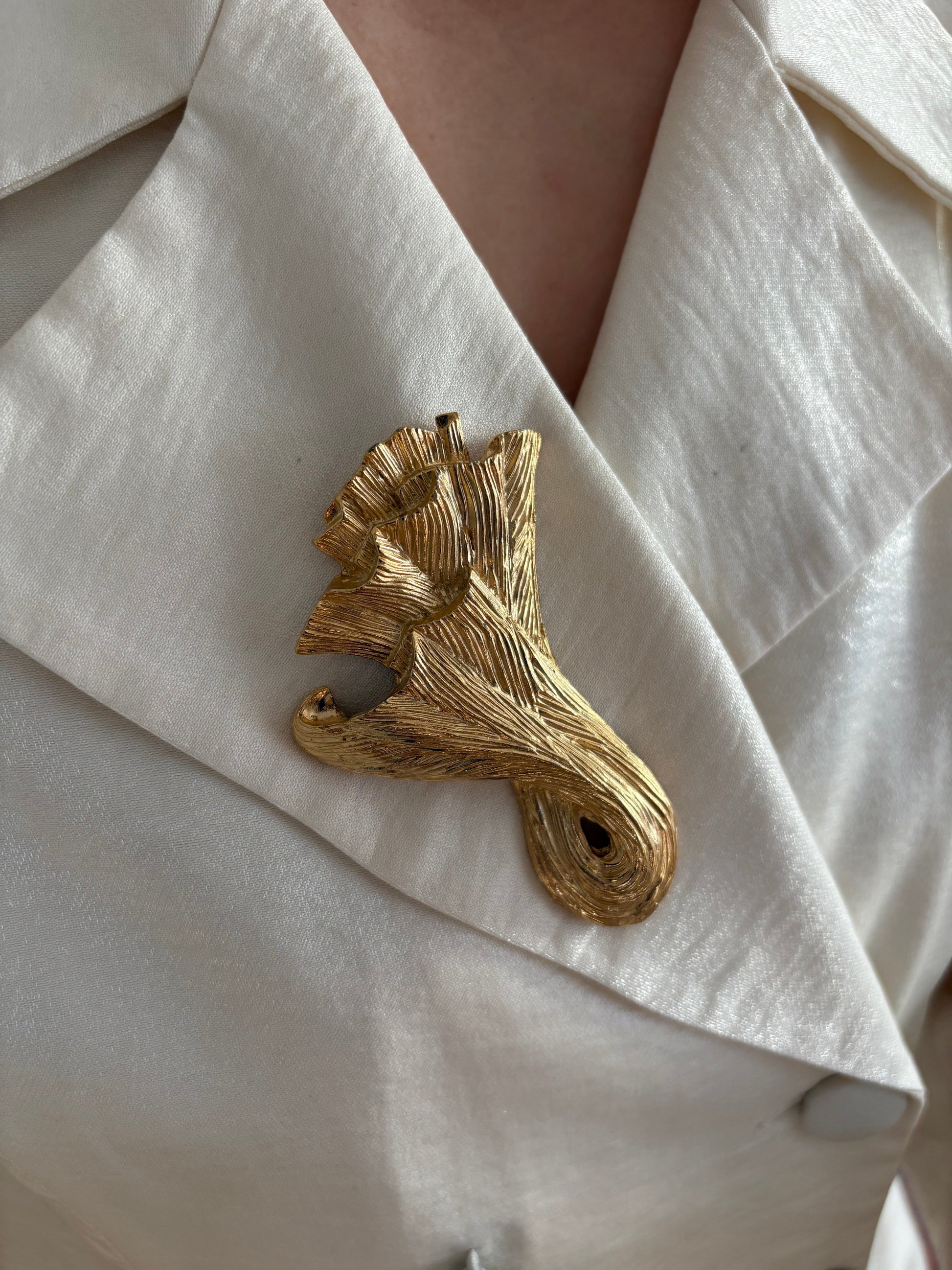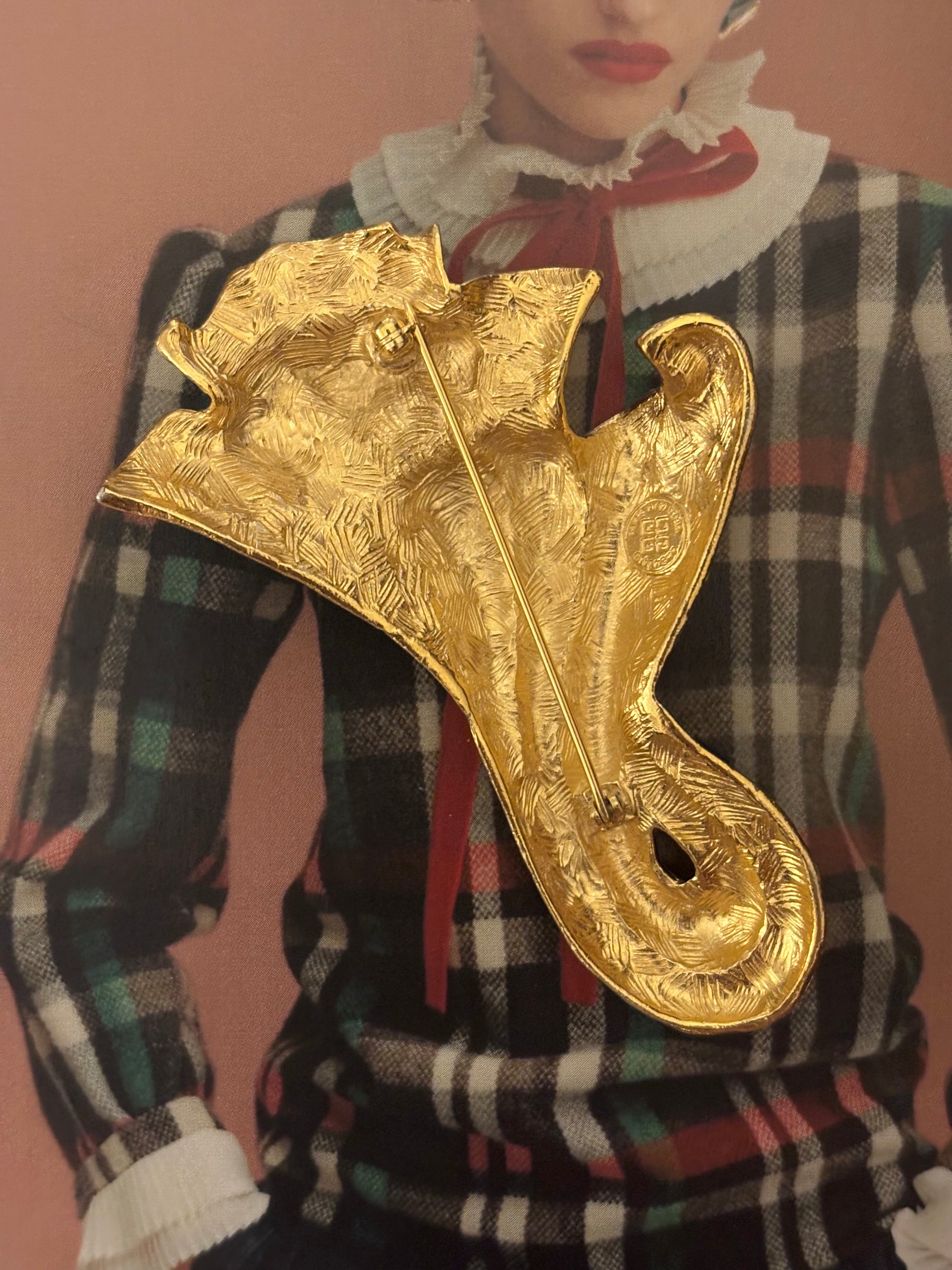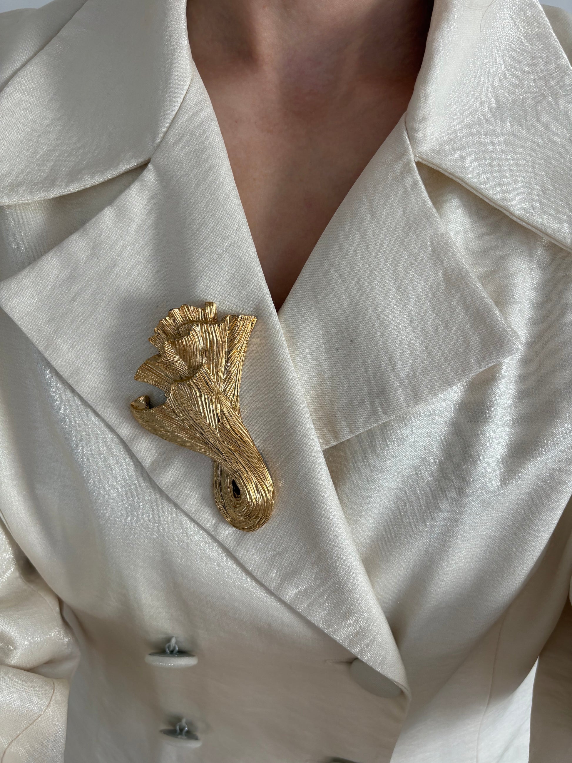 Luksusowa broszka Givenchy kolekcjonerska z lat 80. Przedstawia stylizowany liść miłorzębu japońskiego (Ginkgo biloba), symbol długowieczności i elegancji.