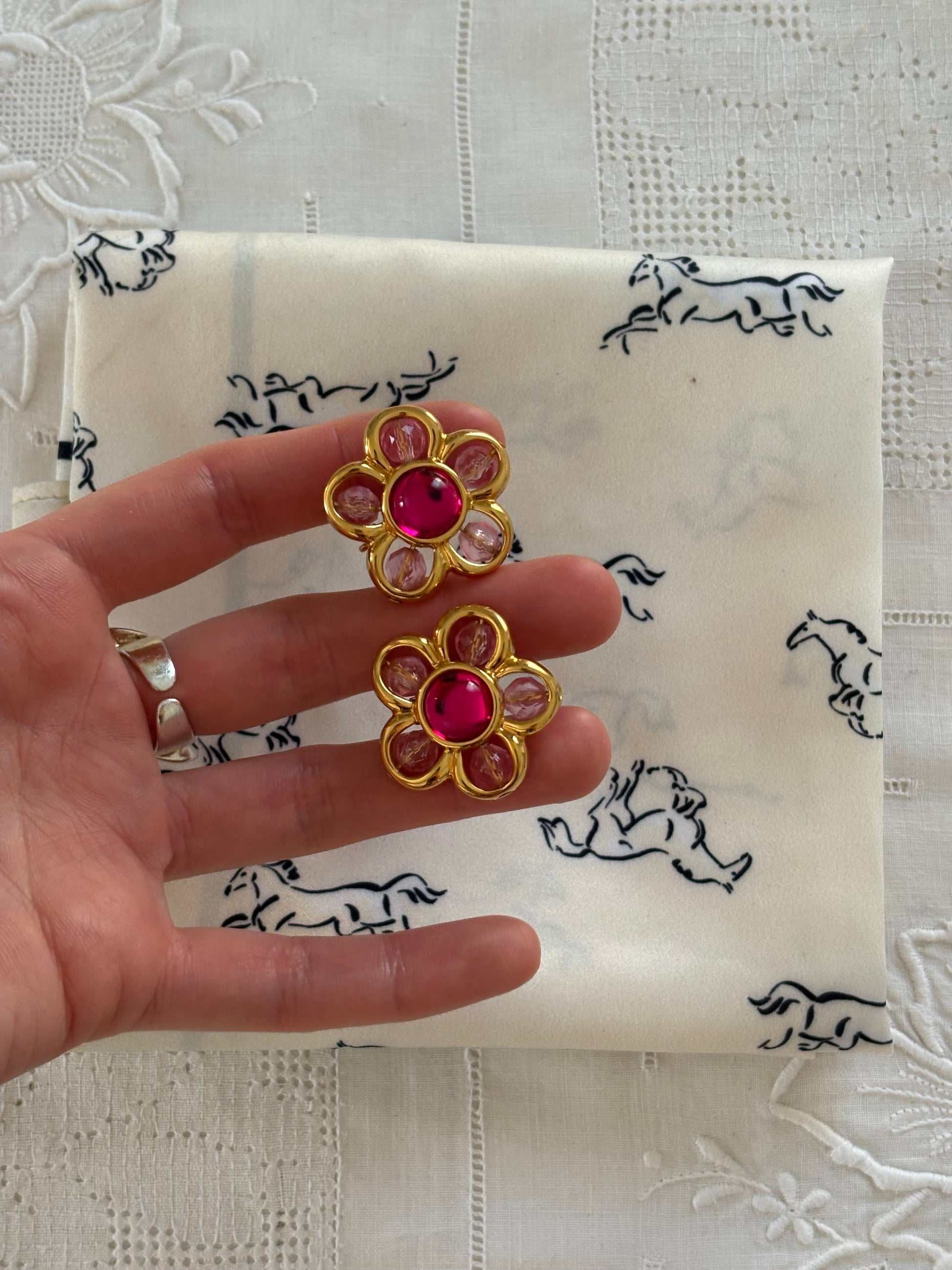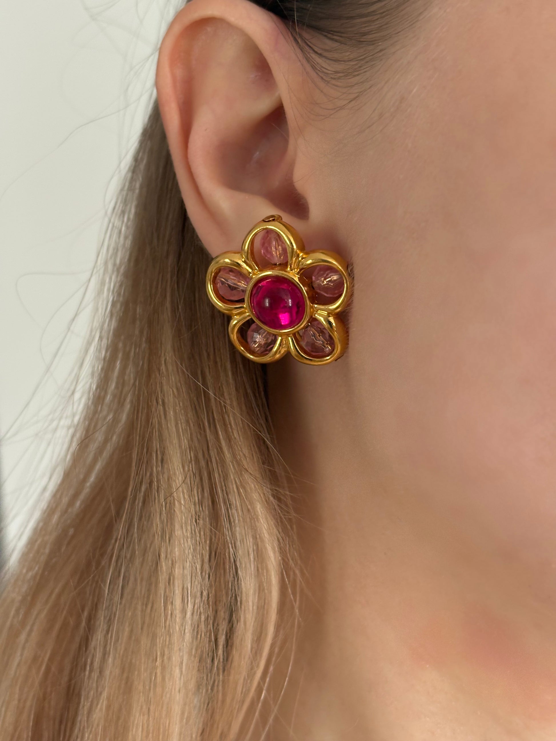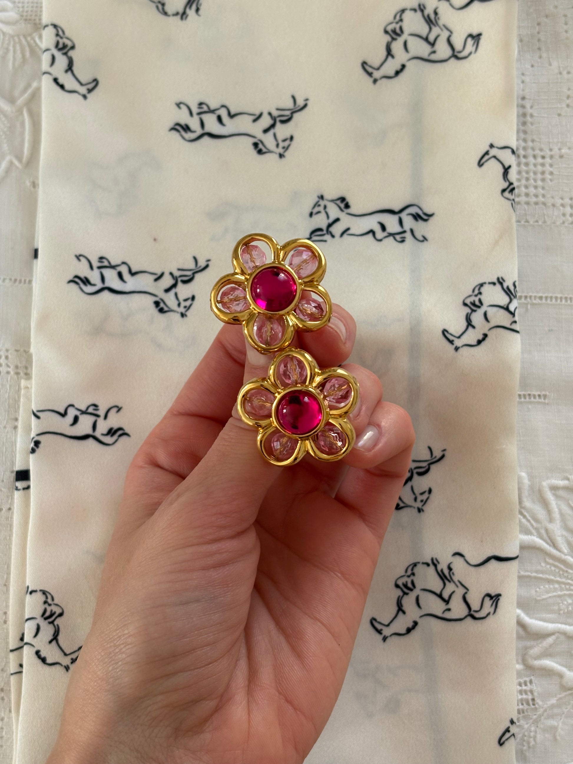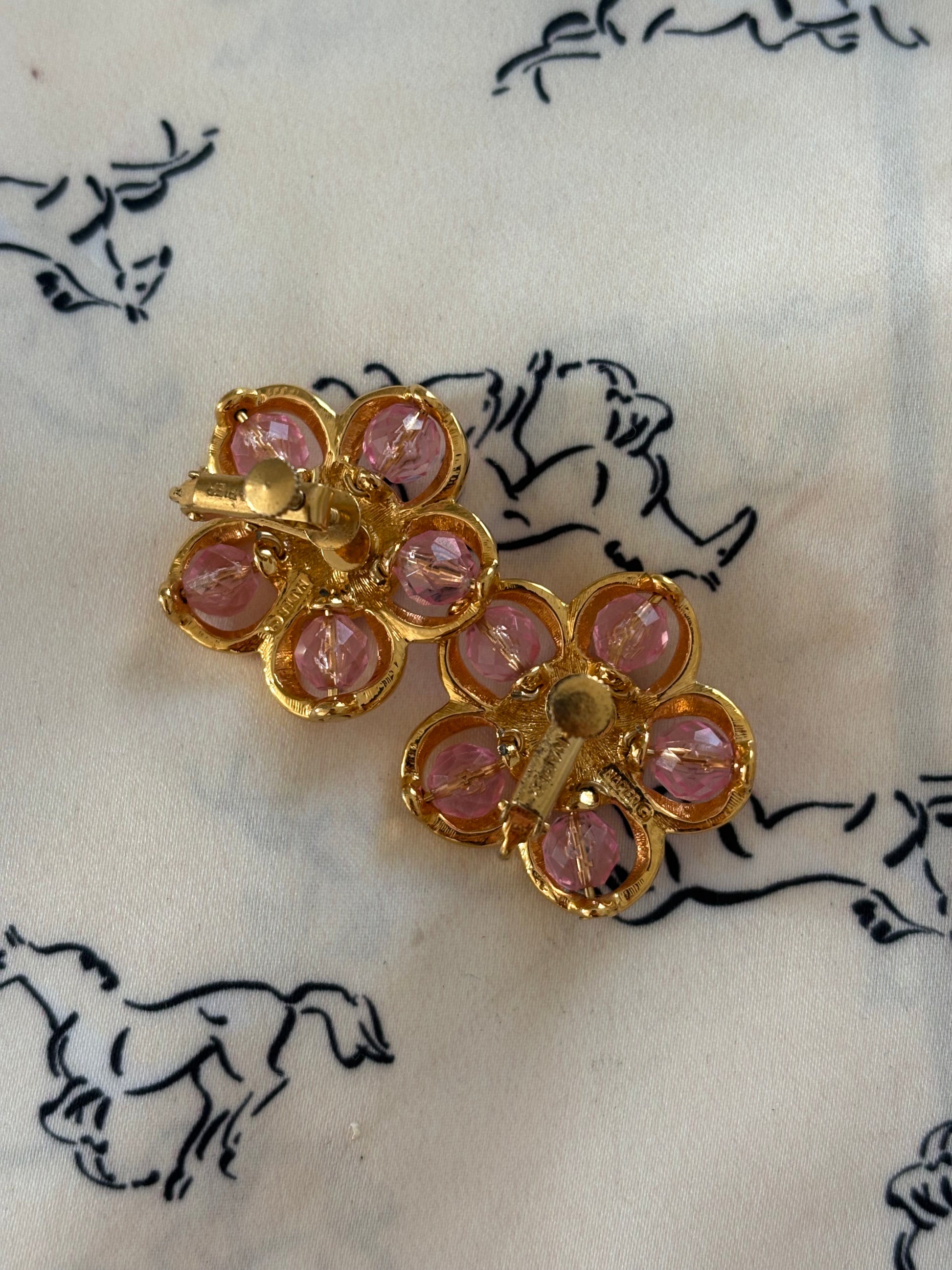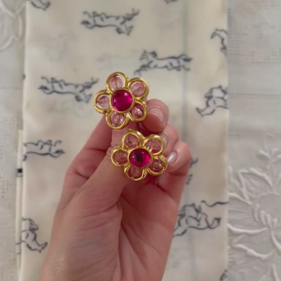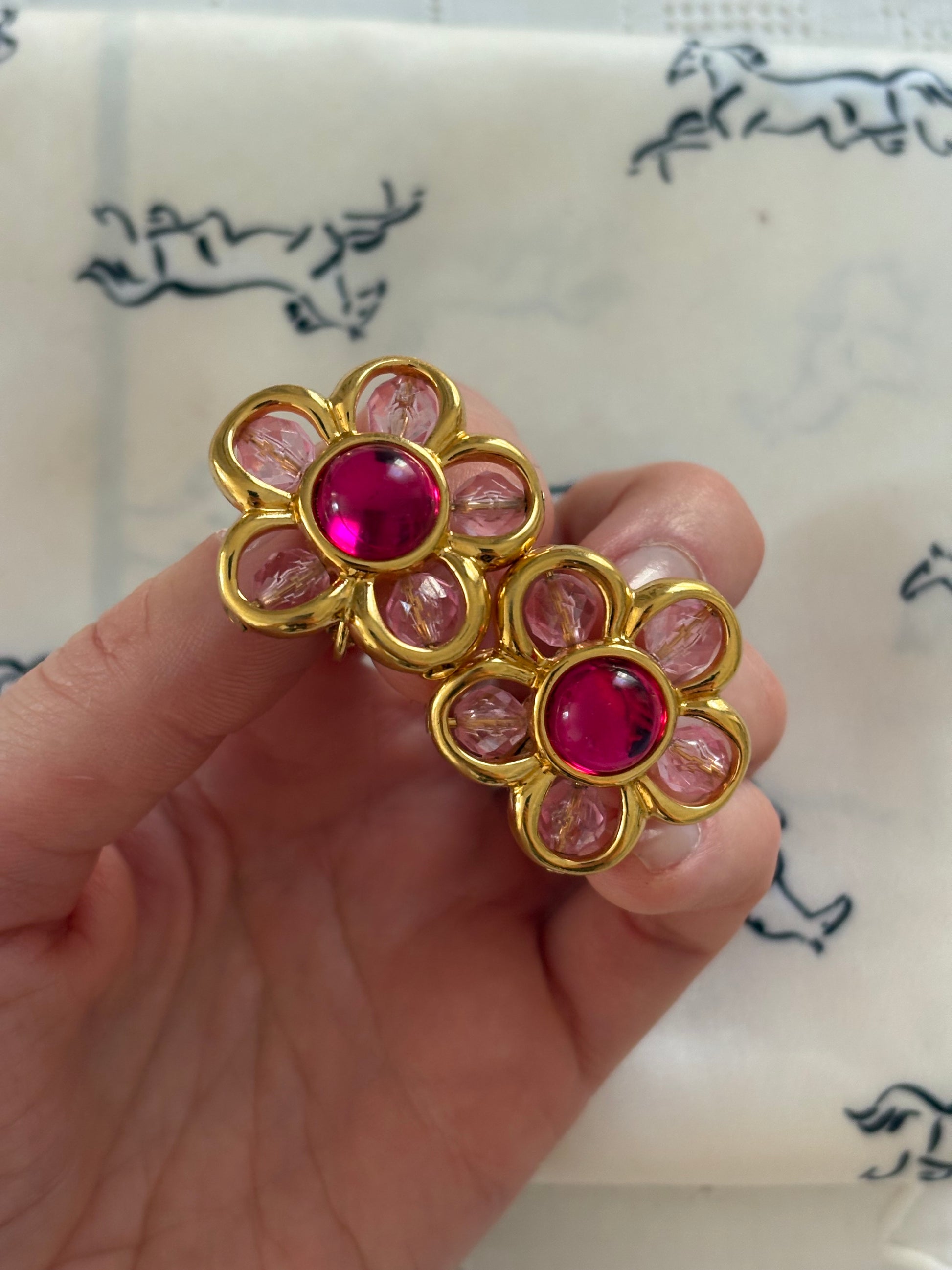 ✔ Spektakularne, rzadkie klipsy w formie kwiatów z centralnym różowym kaboszonem i płatkami z fasetowanych kryształów