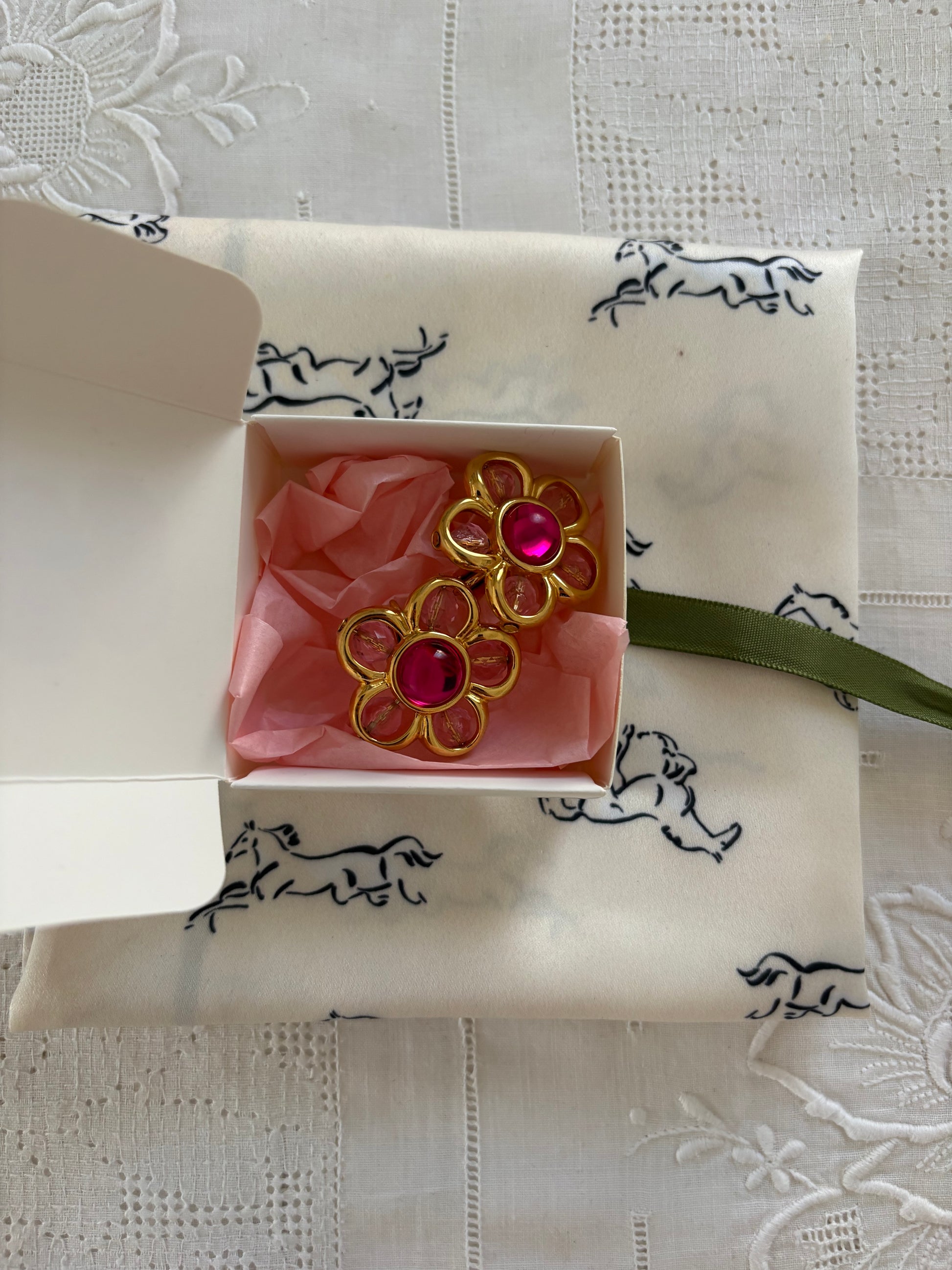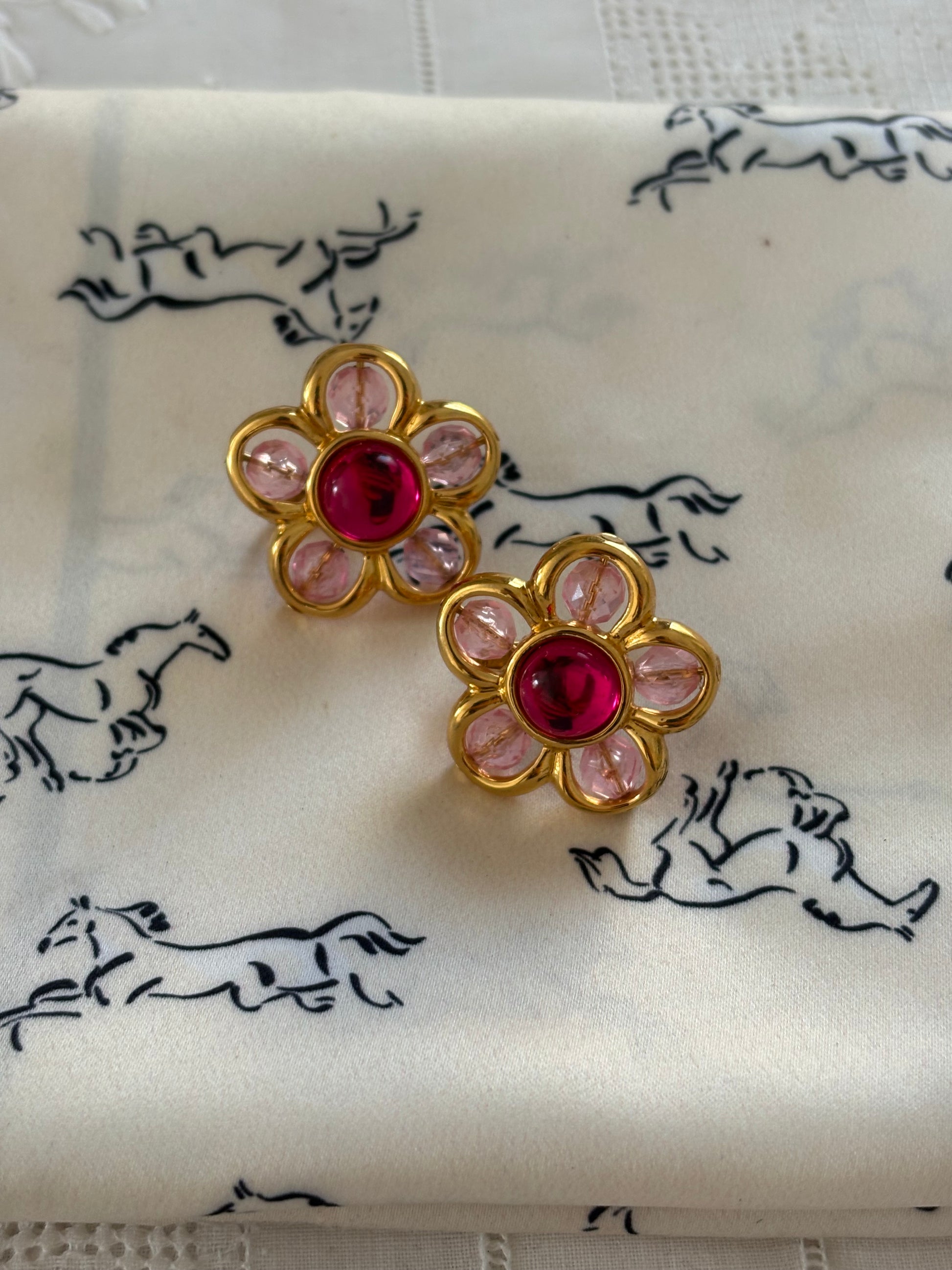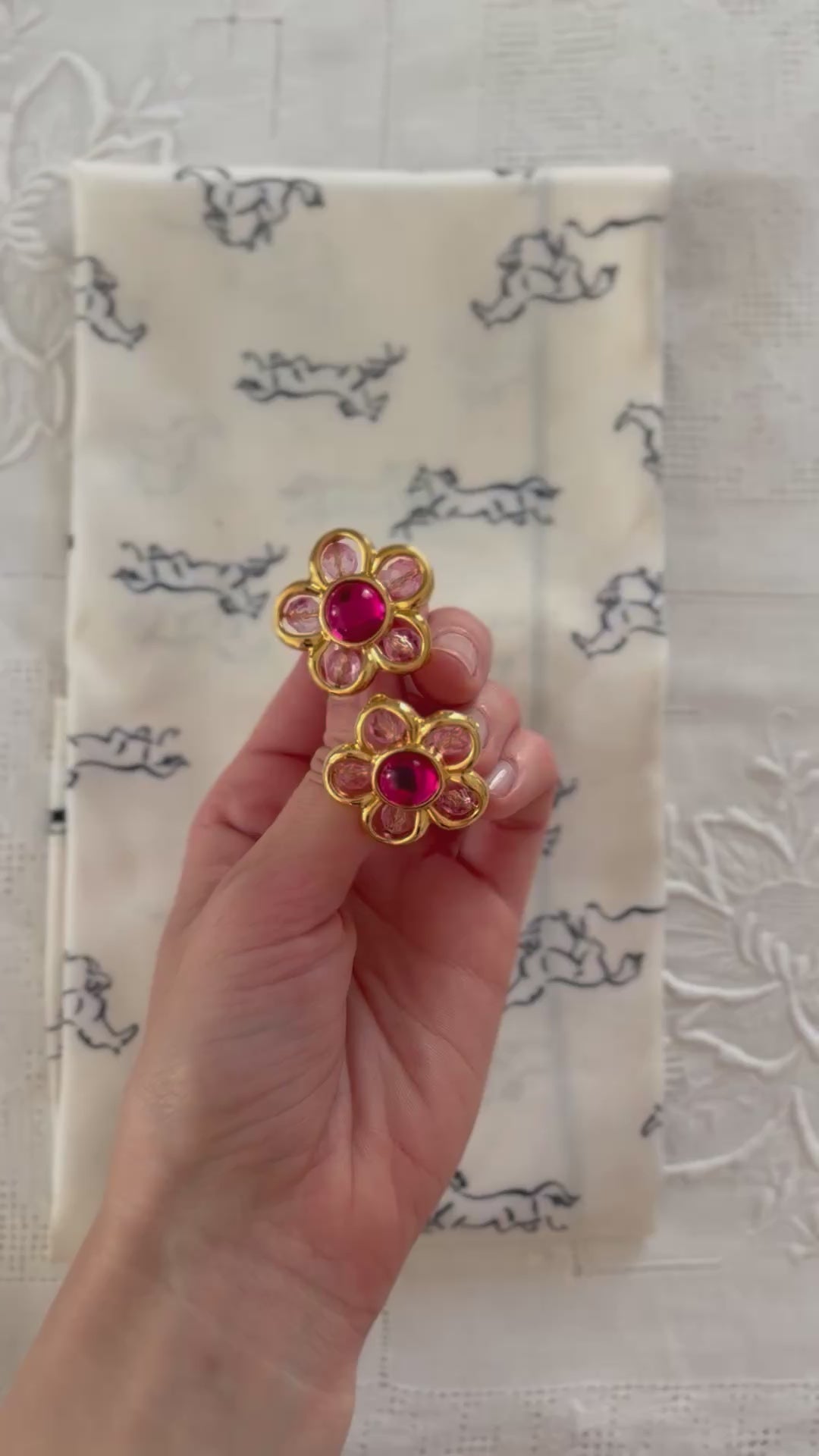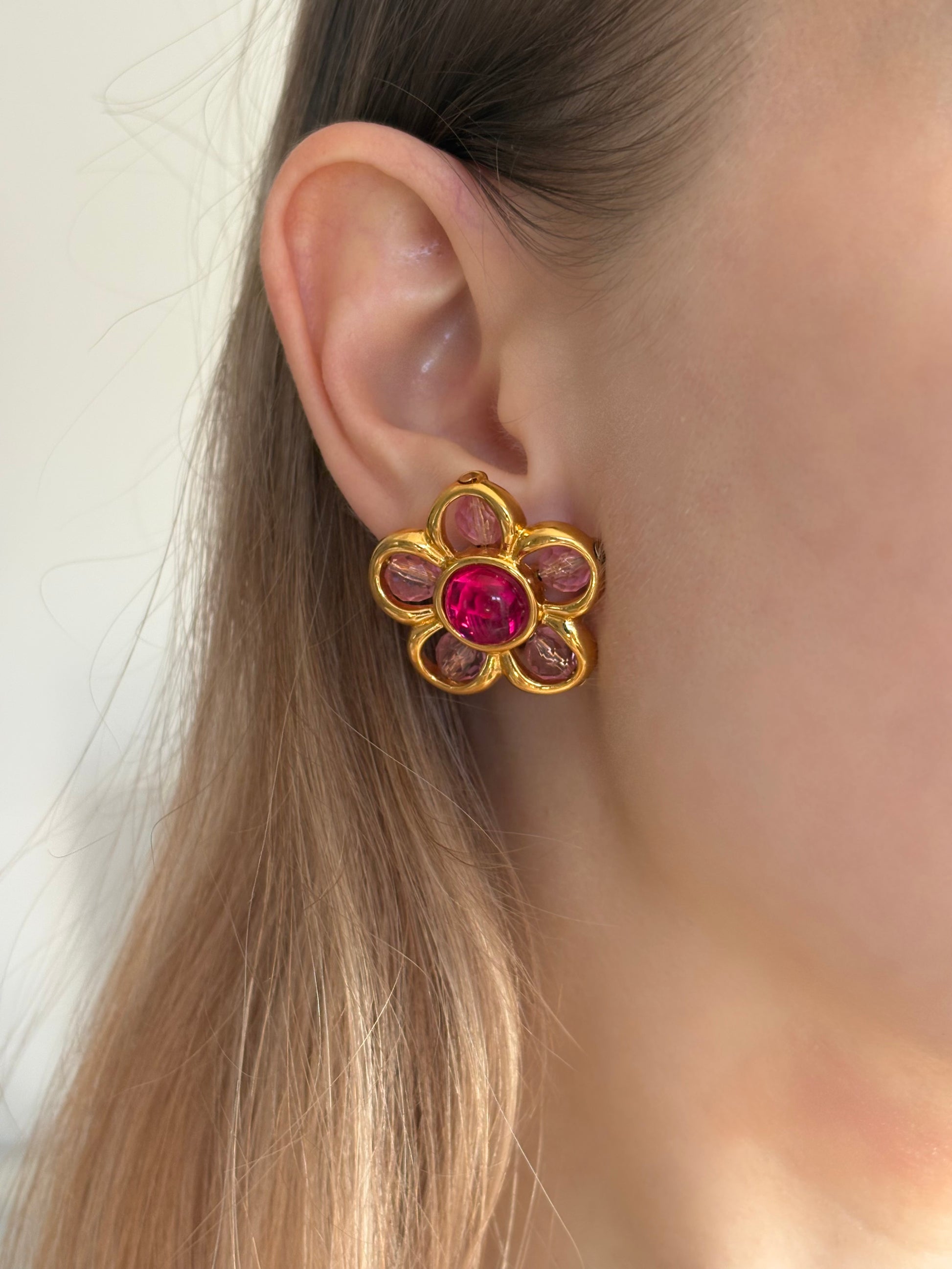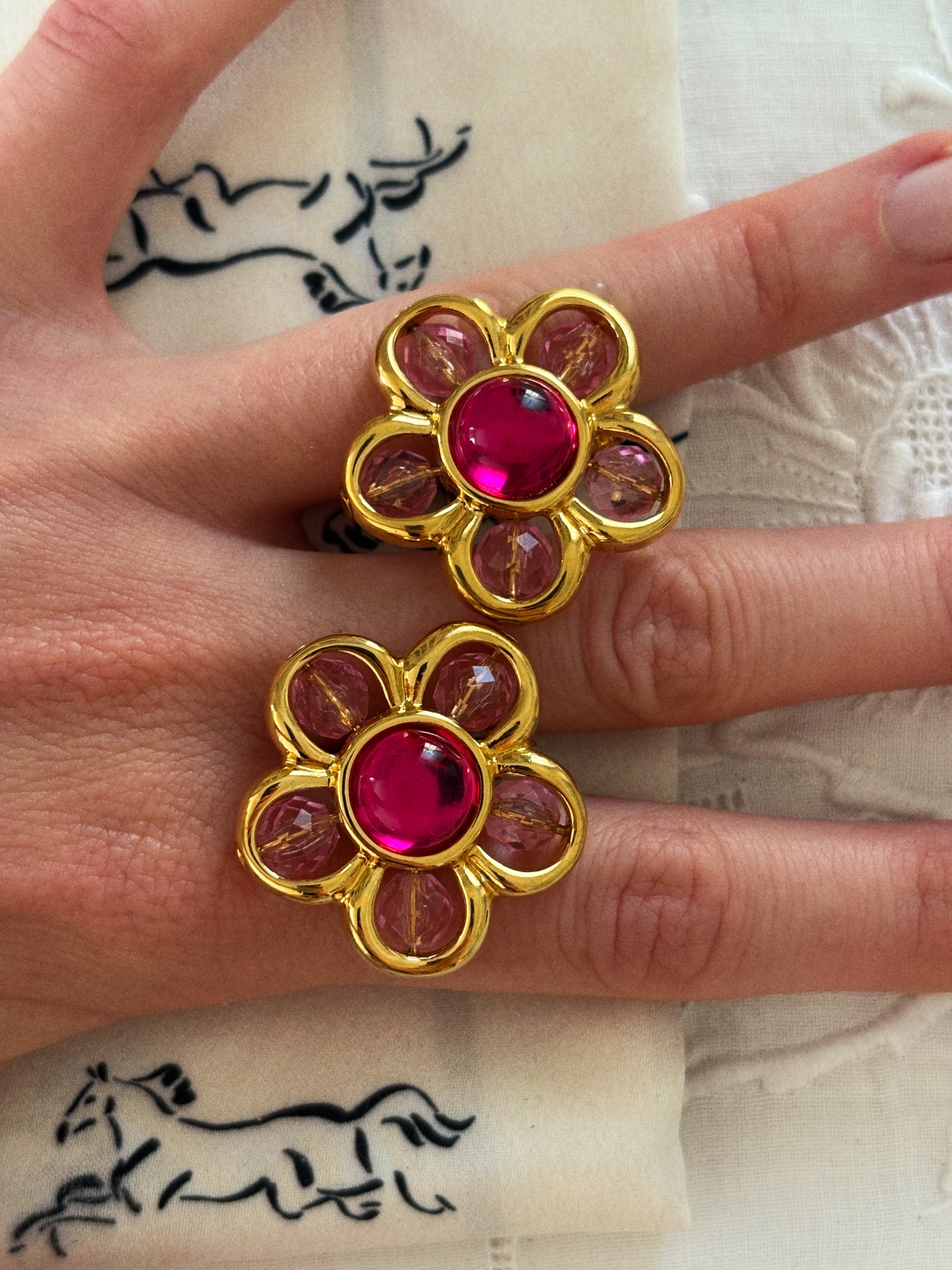 ✔ Spektakularne, rzadkie klipsy w formie kwiatów z centralnym różowym kaboszonem i płatkami z fasetowanych kryształów