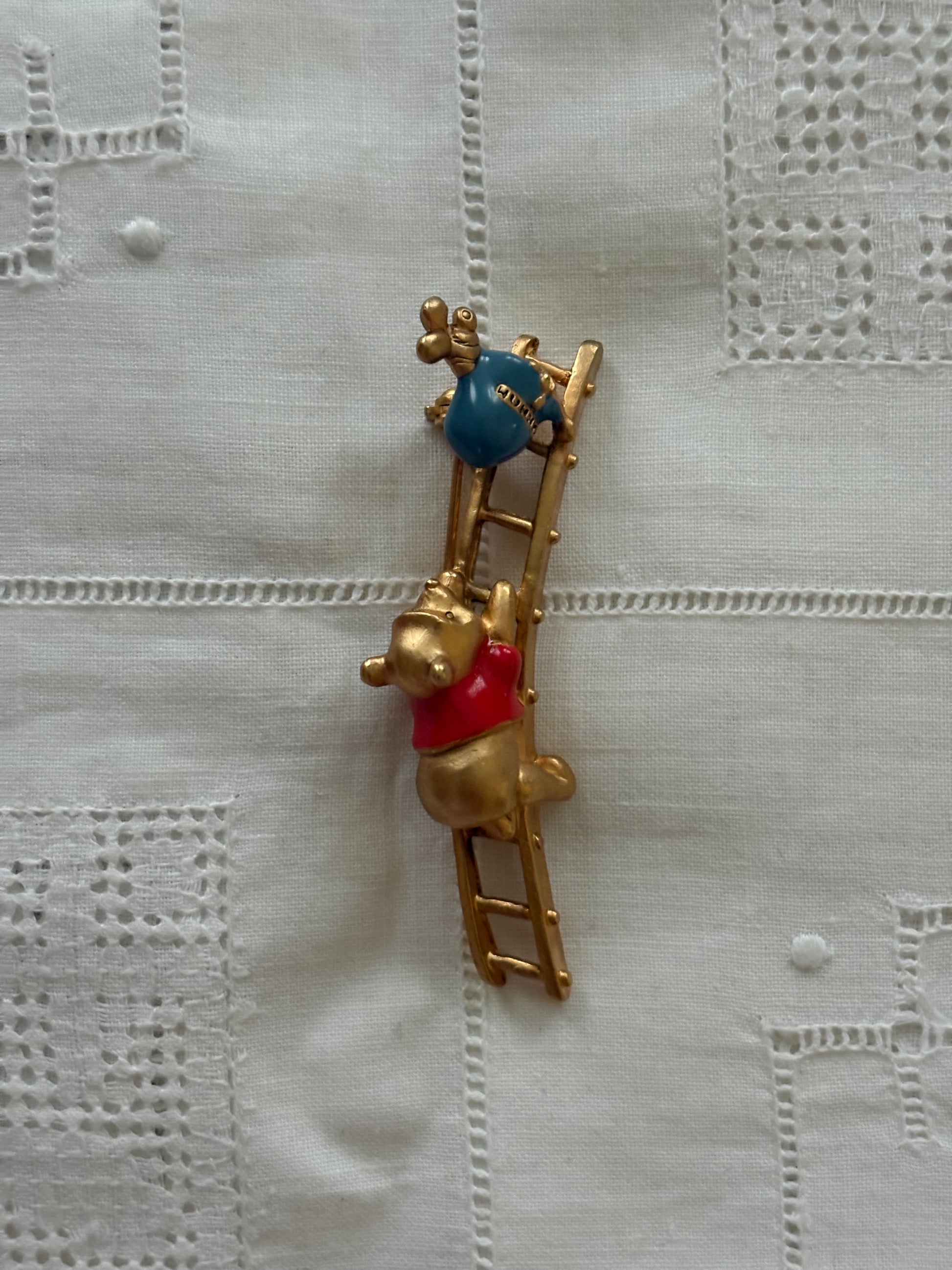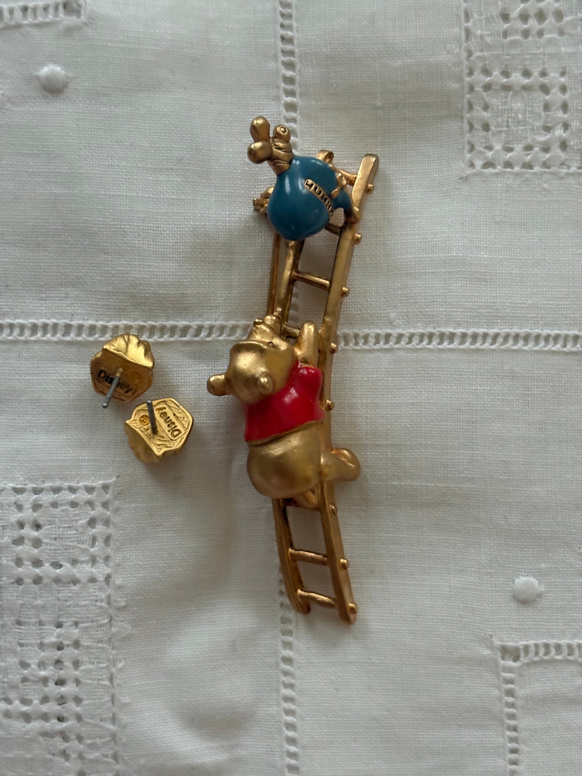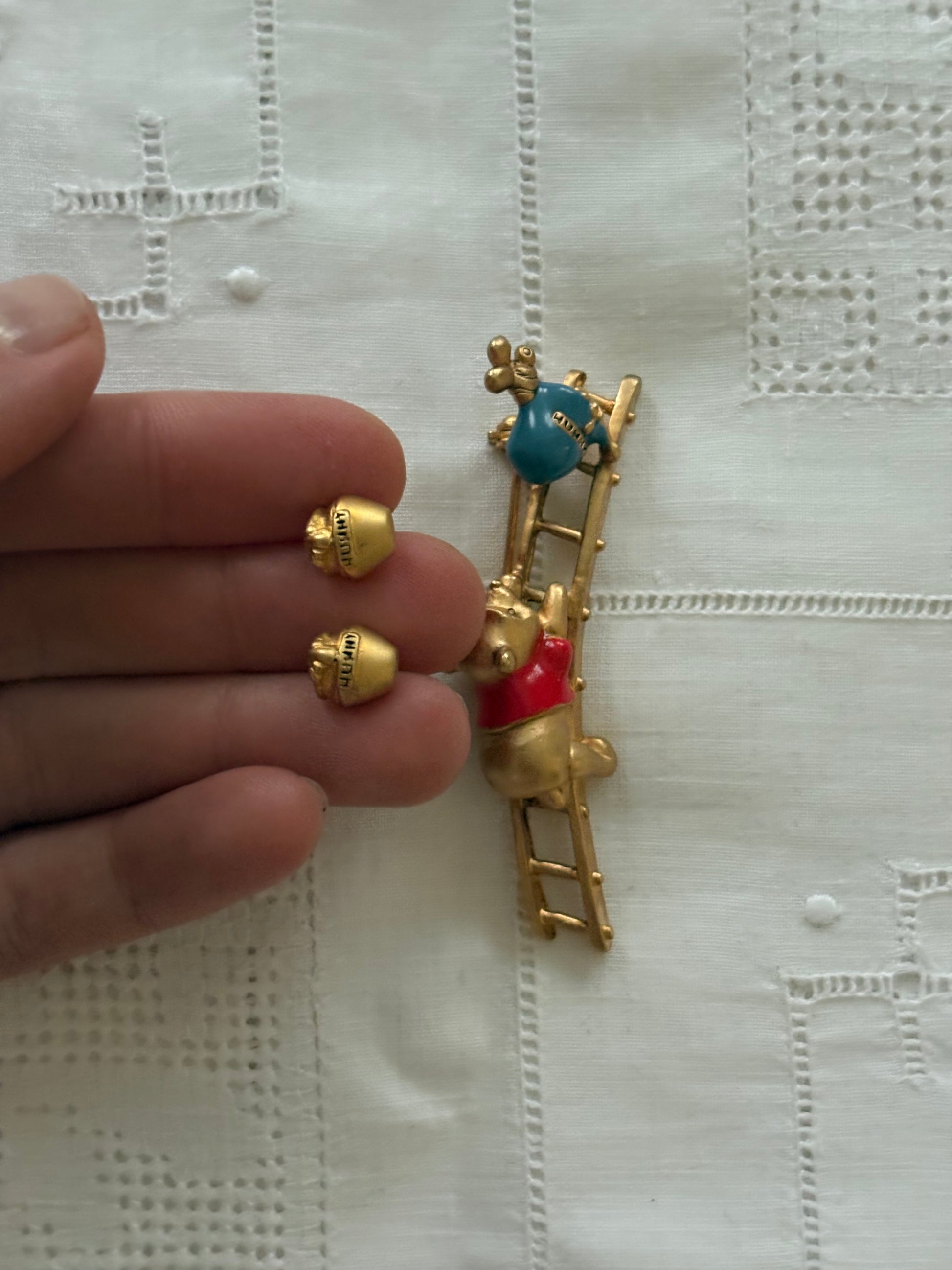 ✔ Uroczy komplet z serii „Winnie the Pooh” – broszka przedstawia Kubusia Puchatka wspinającego się po drabinie po słoik z miodem