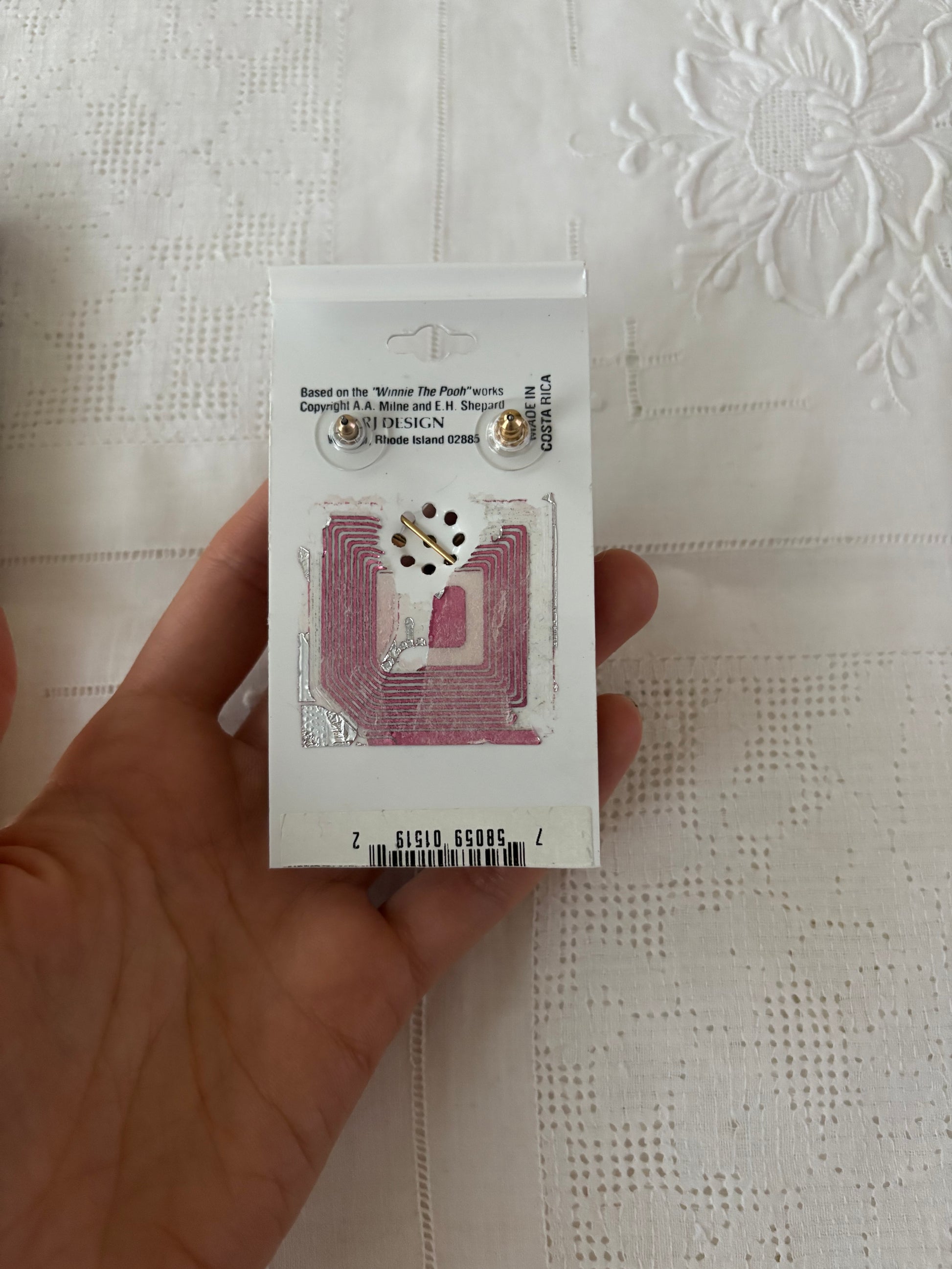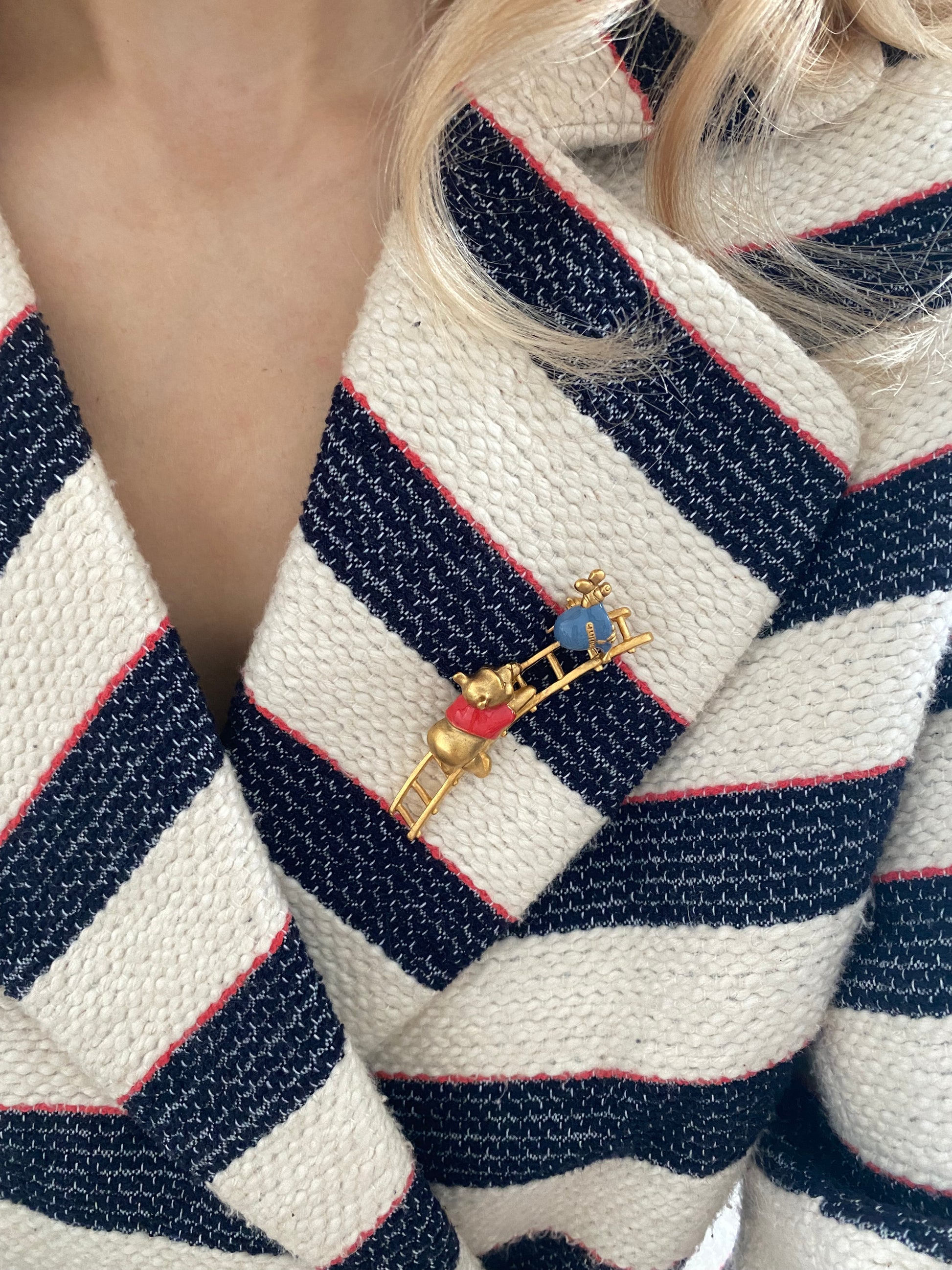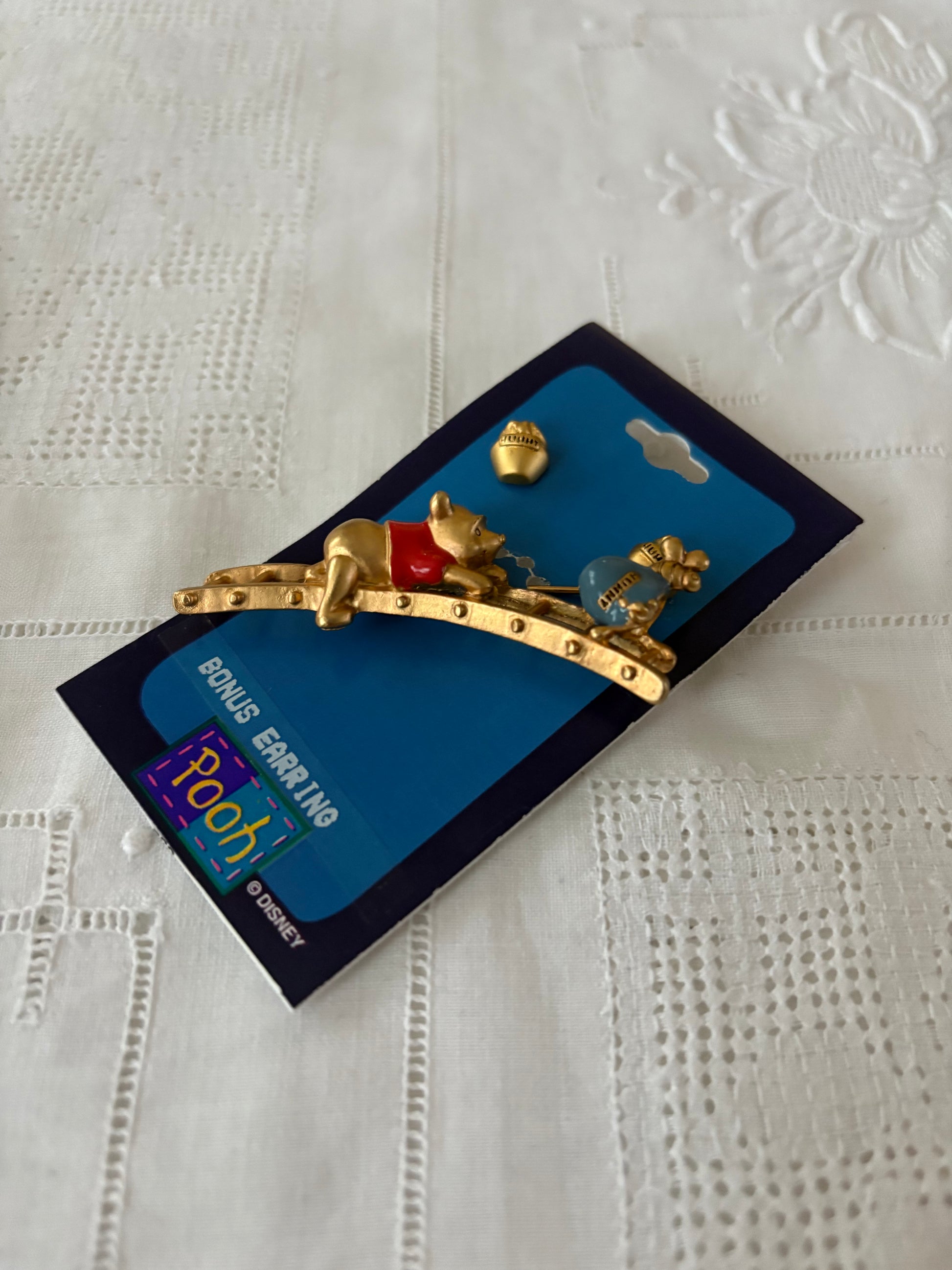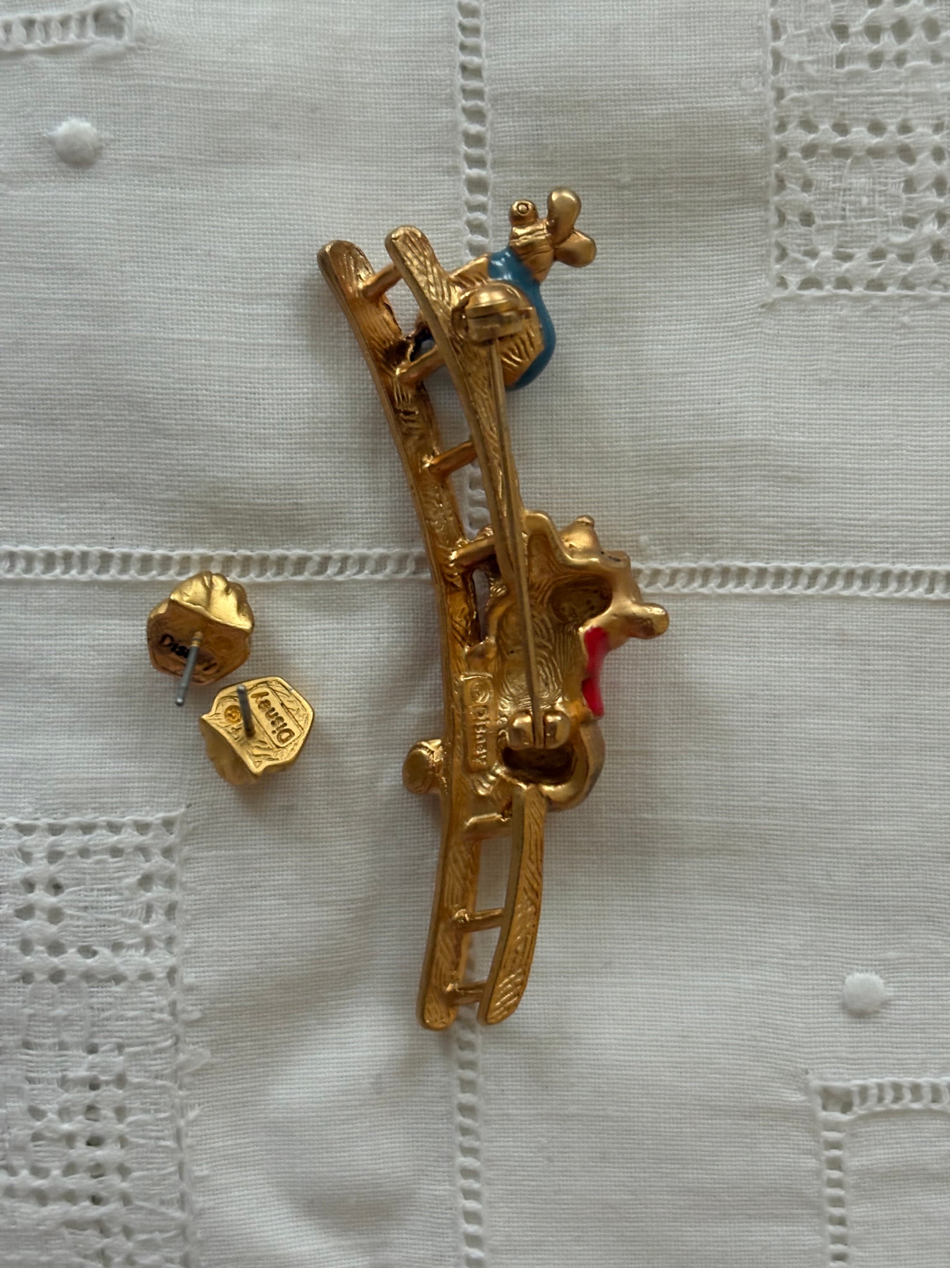✔ Uroczy komplet z serii „Winnie the Pooh” – broszka przedstawia Kubusia Puchatka wspinającego się po drabinie po słoik z miodem