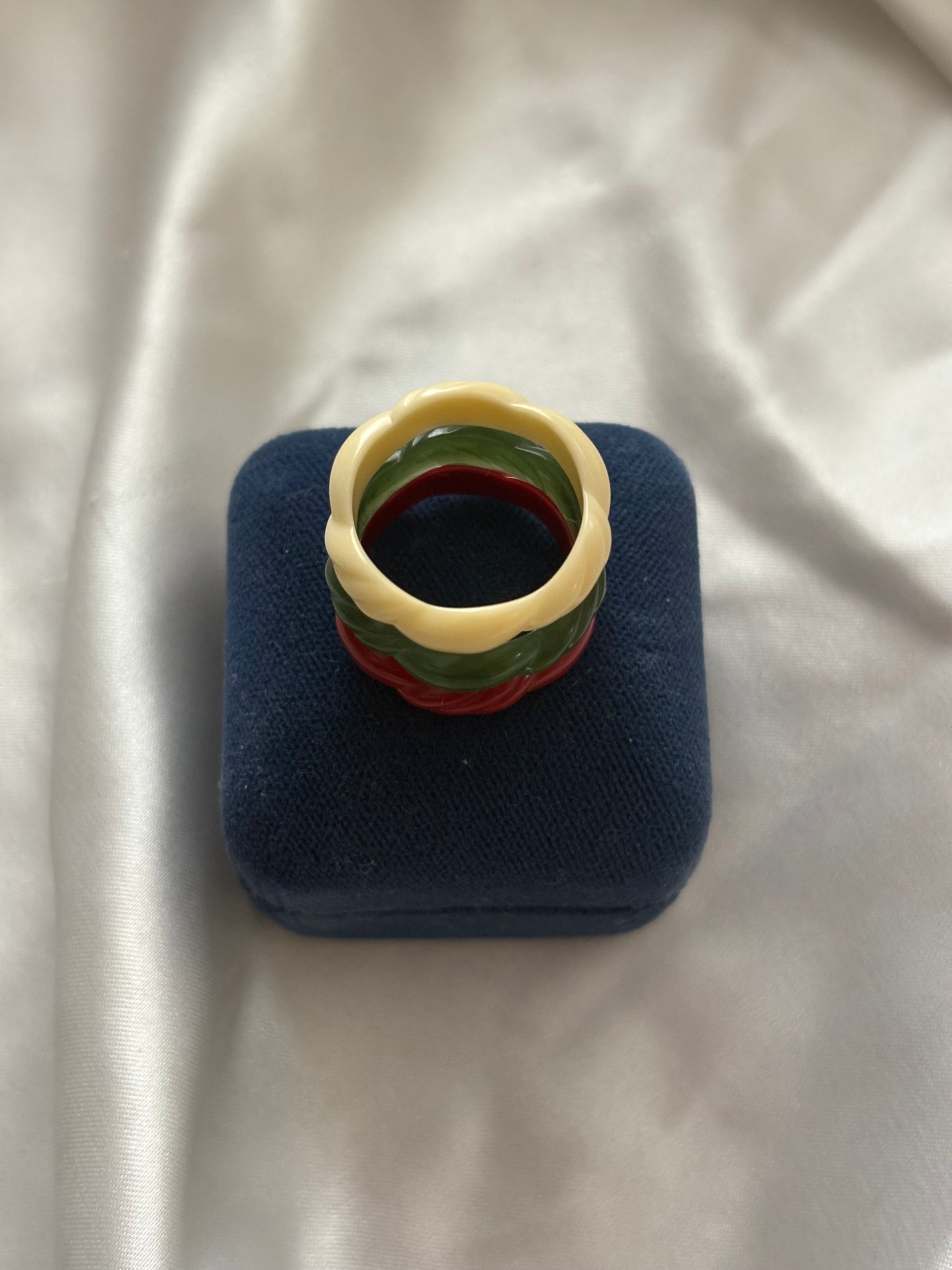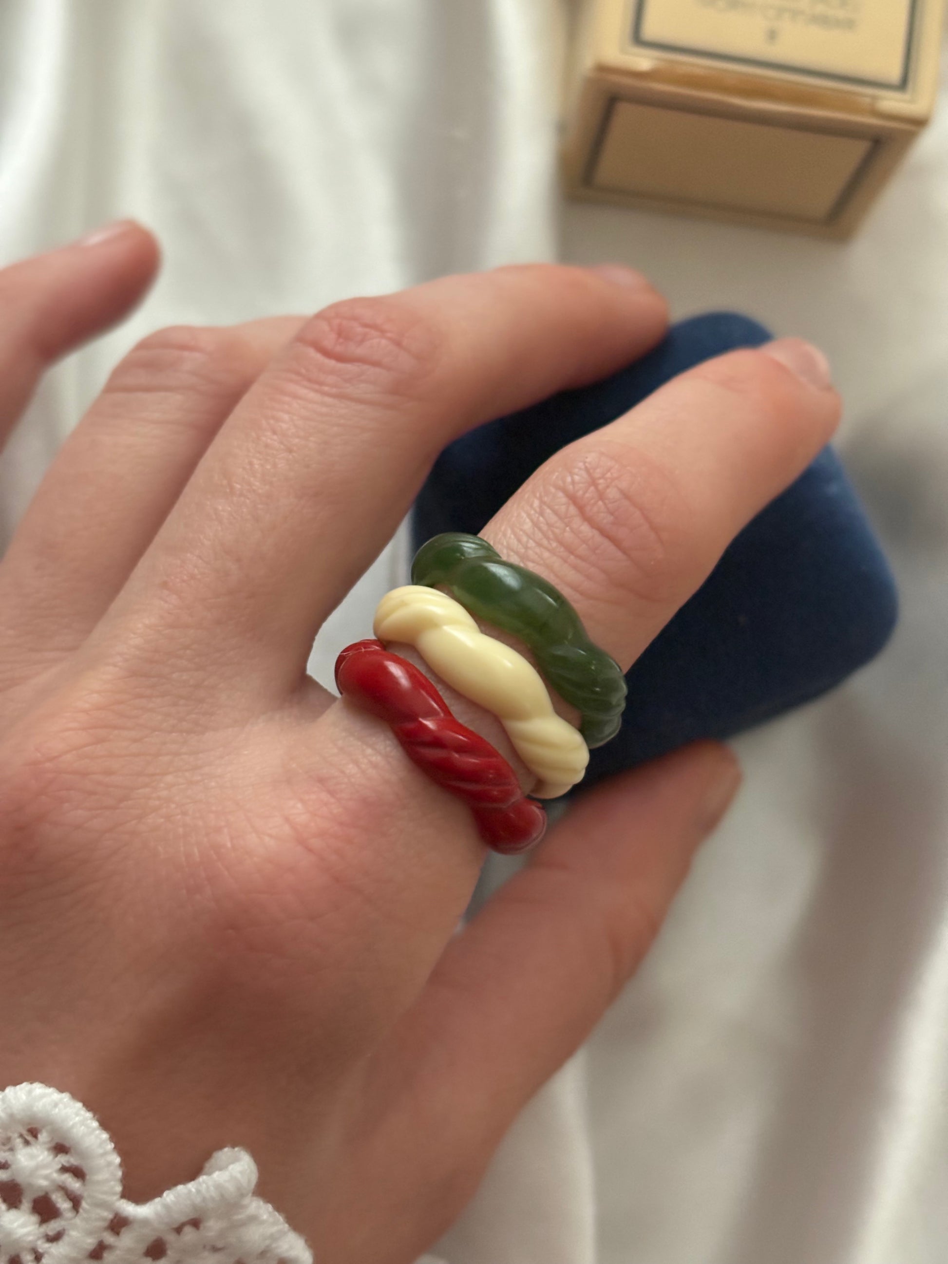 Zestaw składa się z trzech pierścionków, wykonanych z tworzywa imitującego. Inspirowane estetyką Dalekiego Wschodu:
